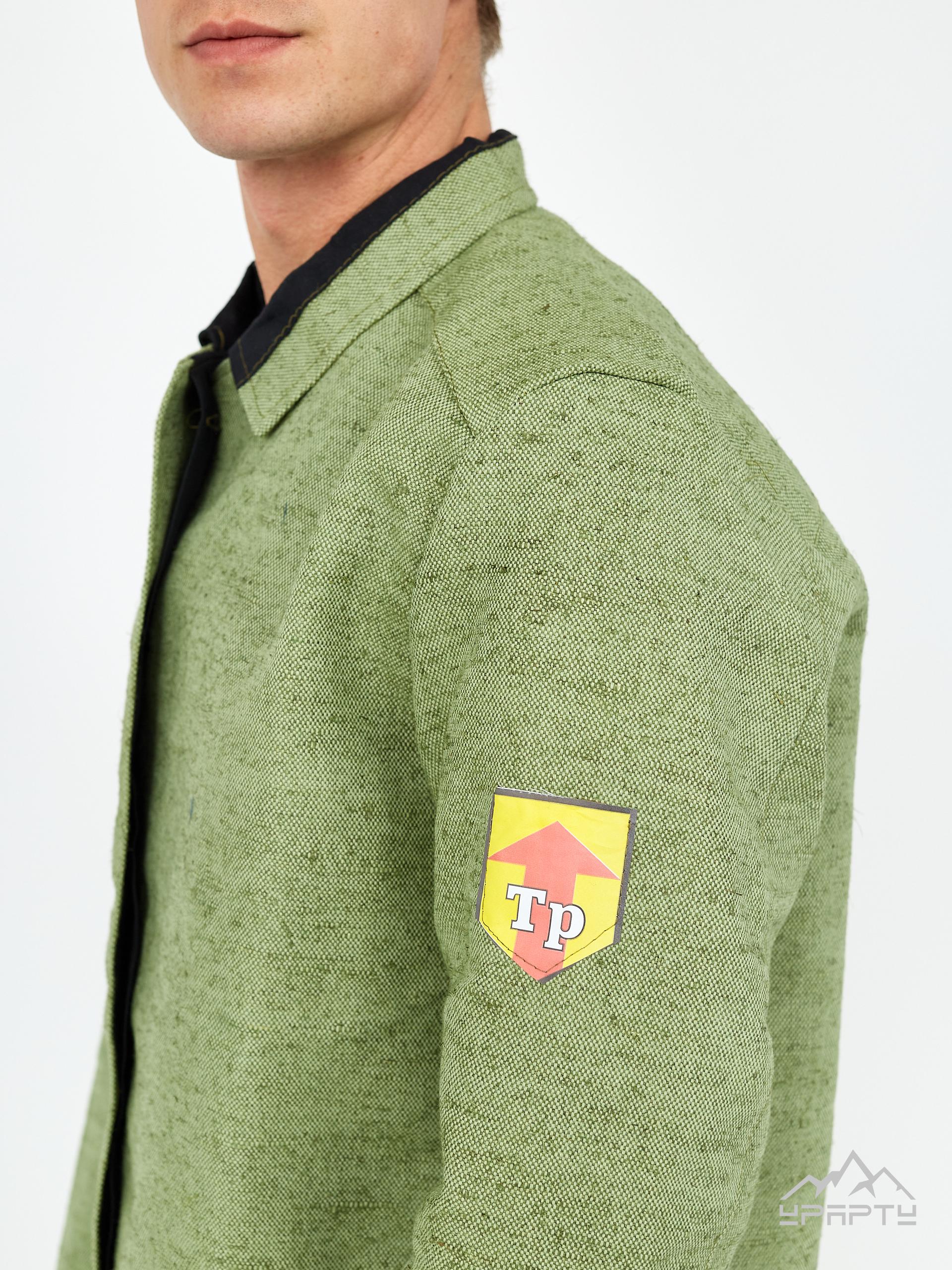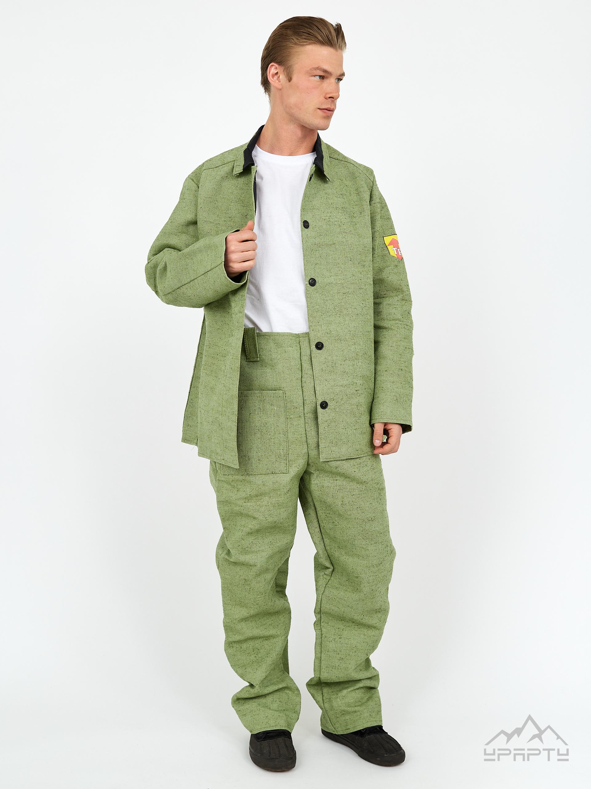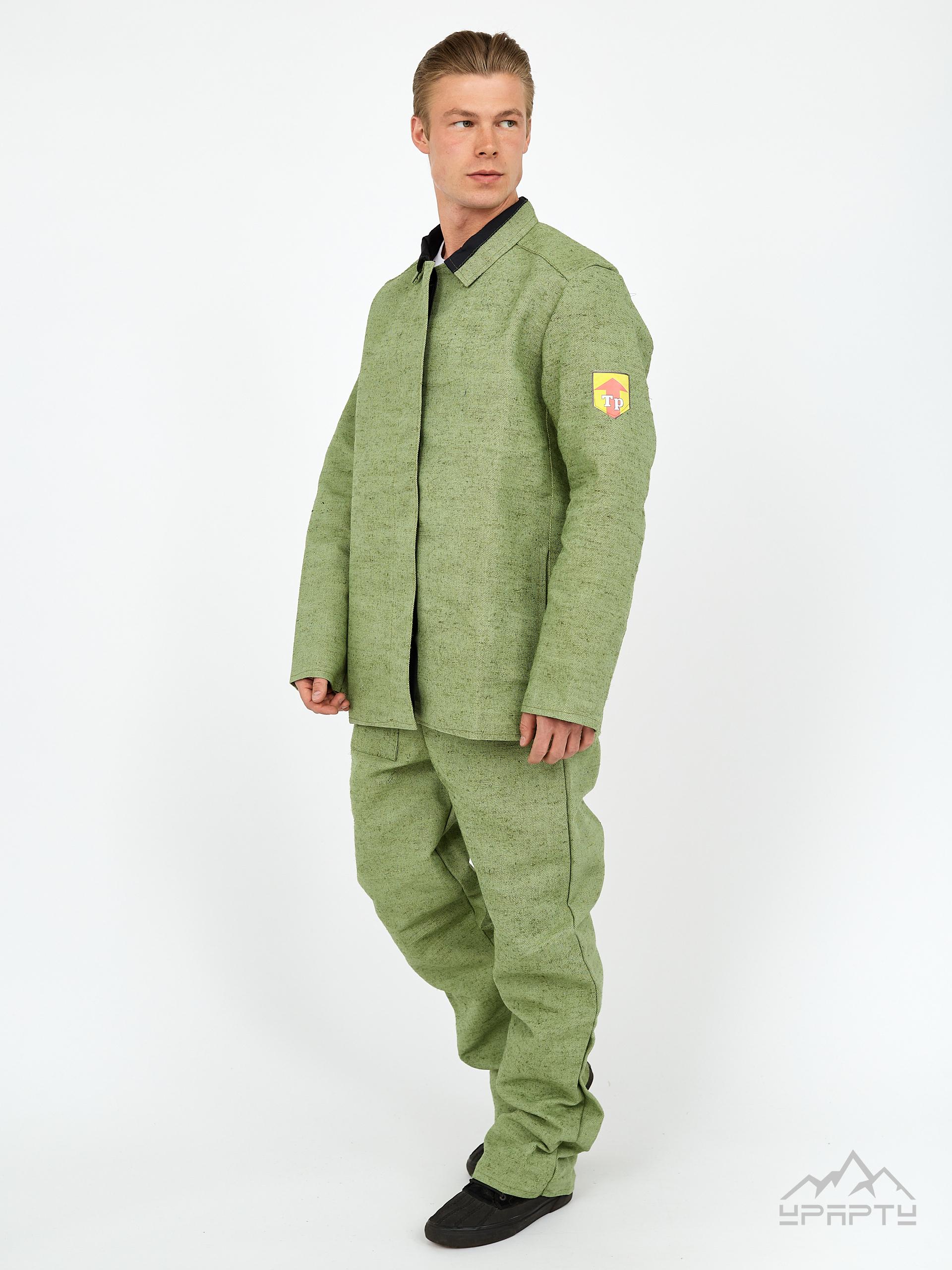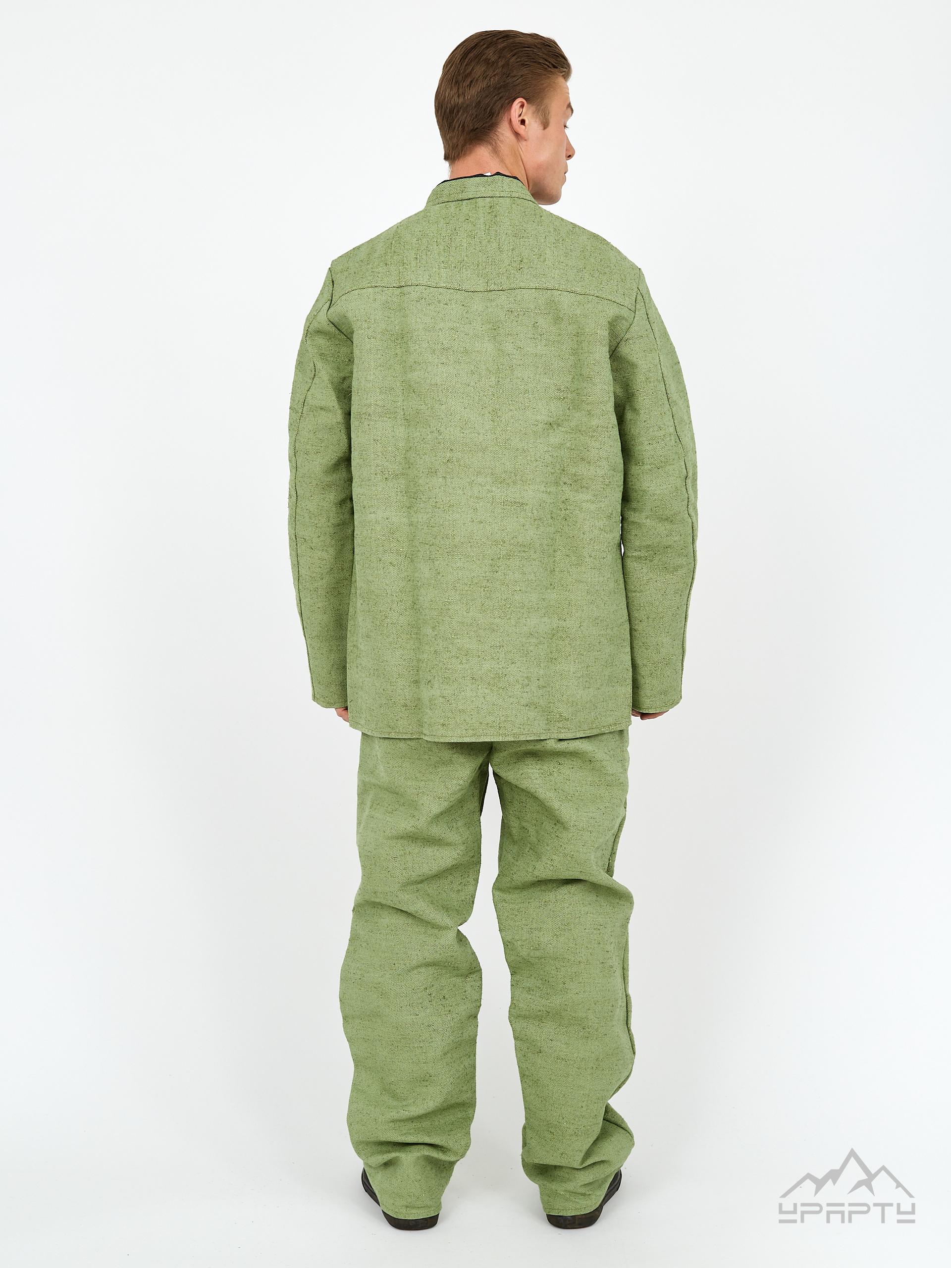 Костюм состоит из куртки и брюк. Куртка с центральной потайной застежкой на петли и пуговицы. Полочка с кокеткой. Полочка состоит из центральной и боковой частей. В швах стачивания внутренние боковые карманы - подзоры из парусины (брезента), мешковина - из бязи. На отрезном бочке два вентиляционных отверстия- прорезные обмётанные петли.