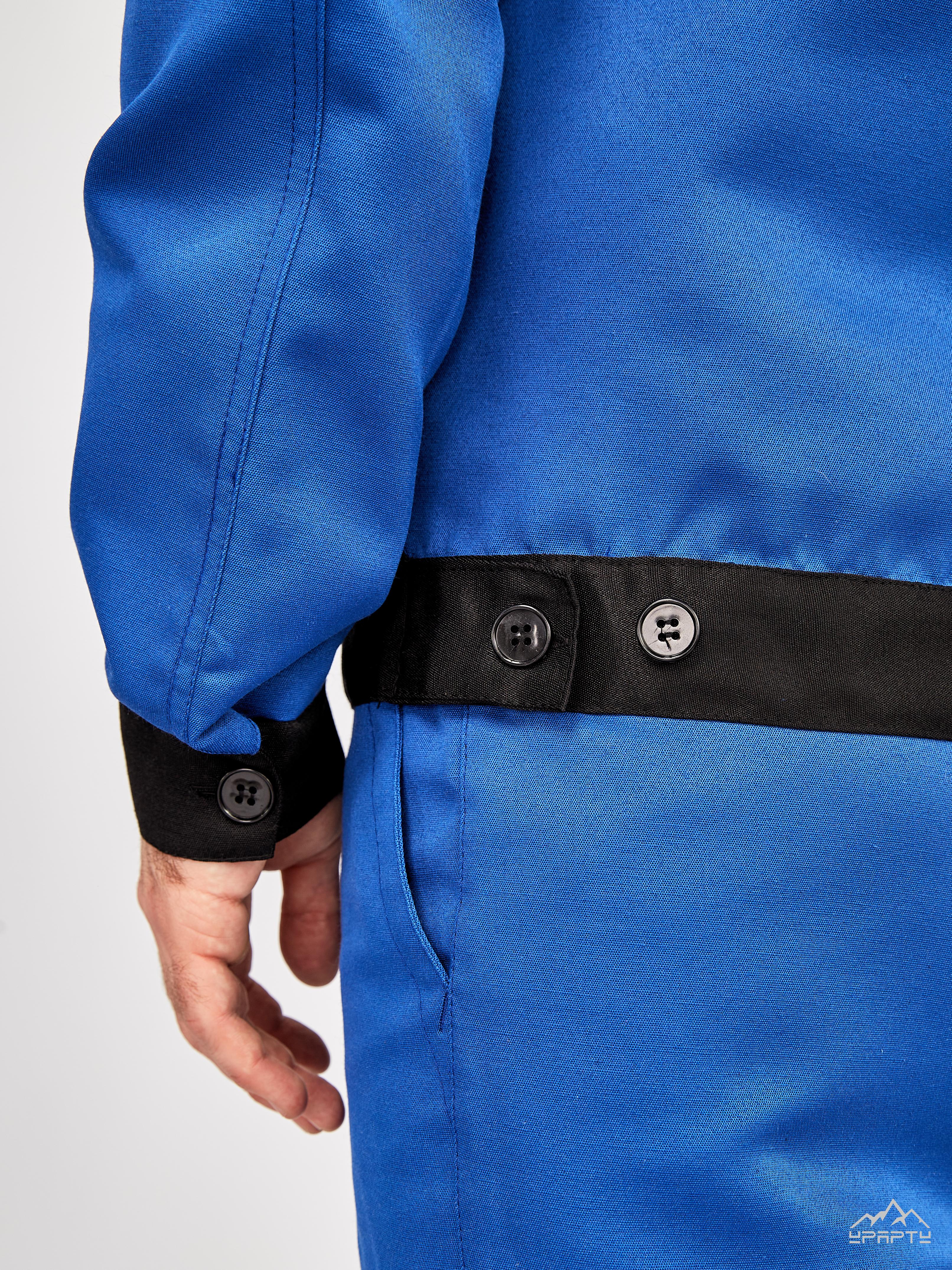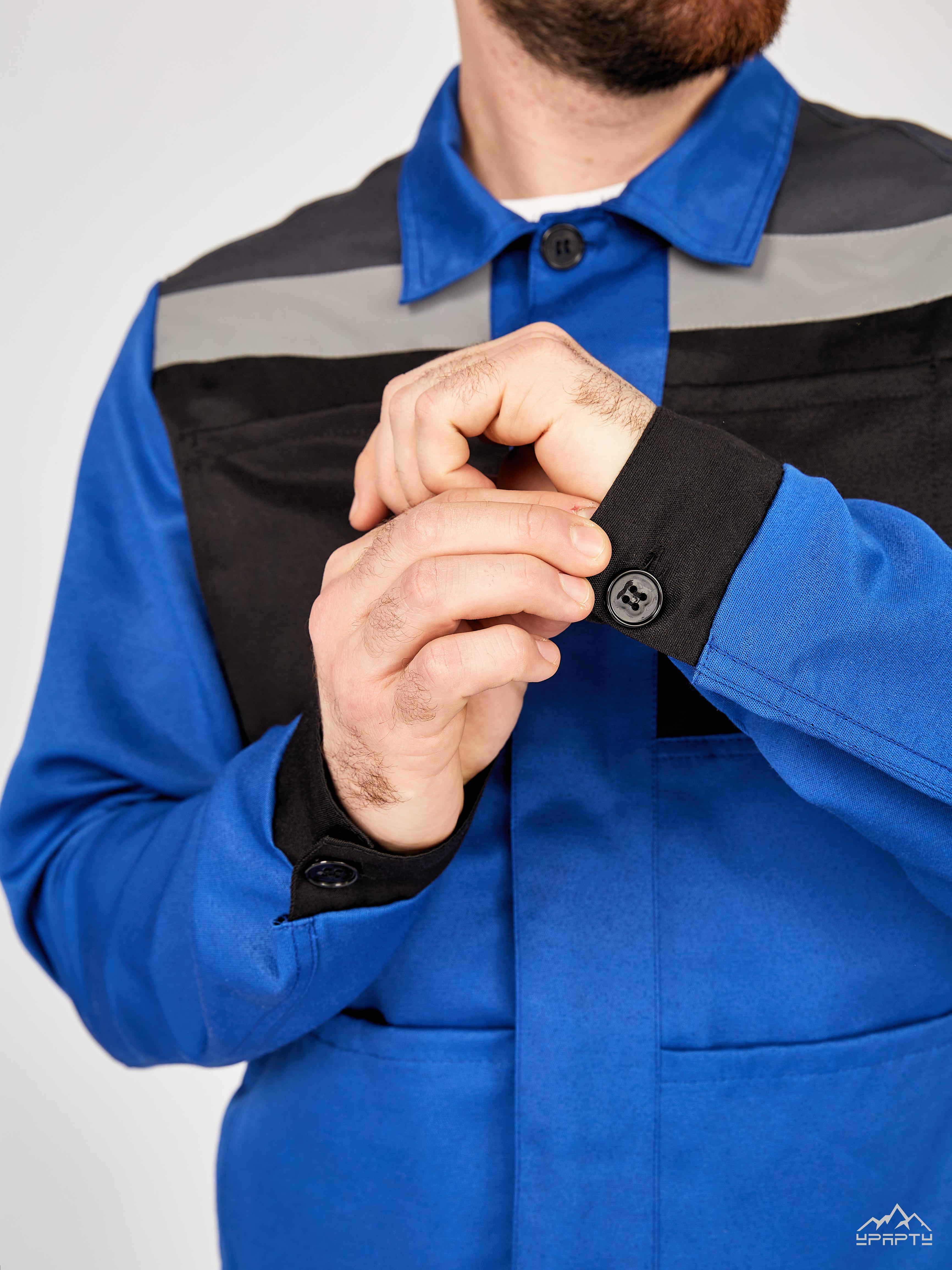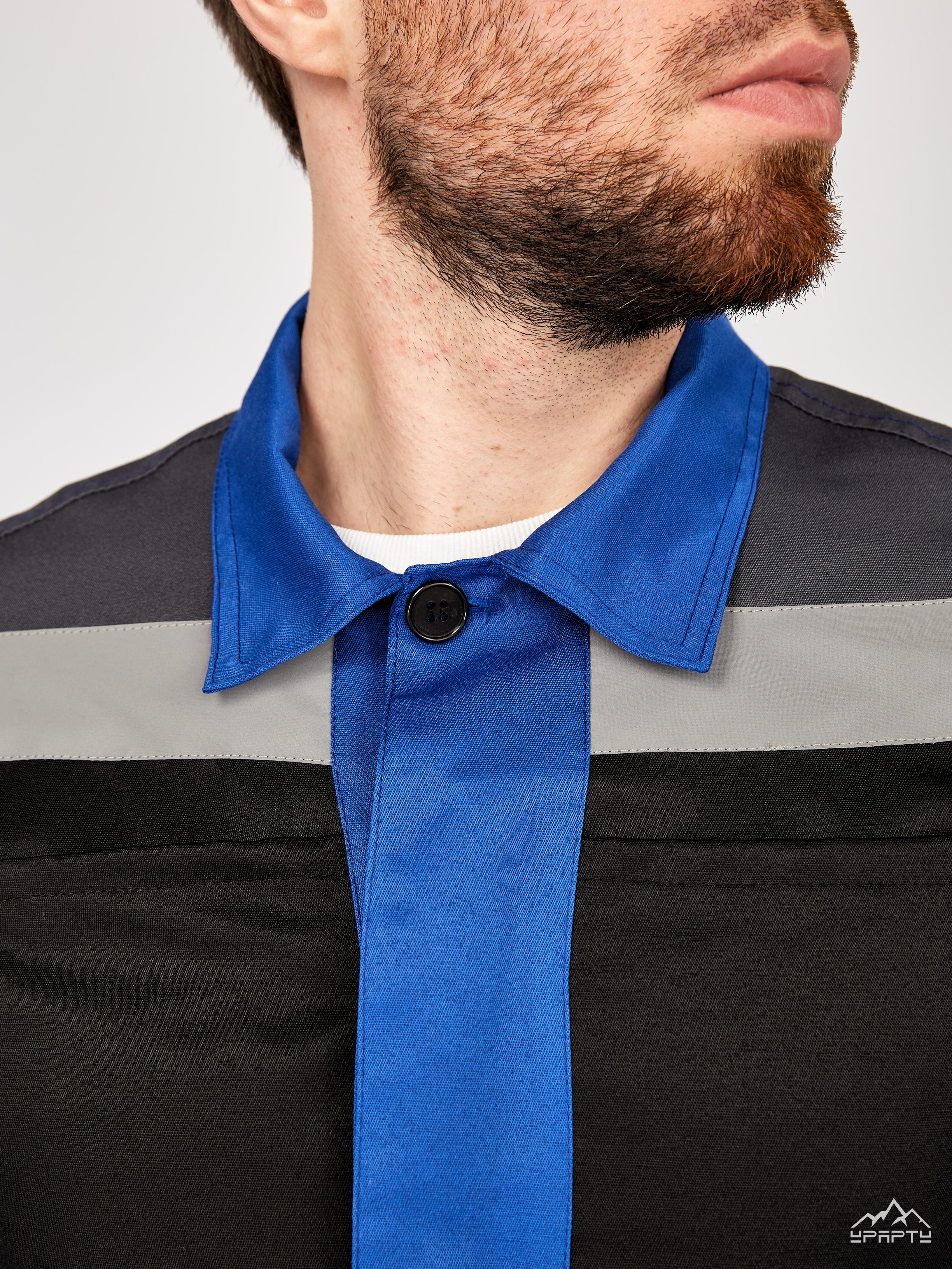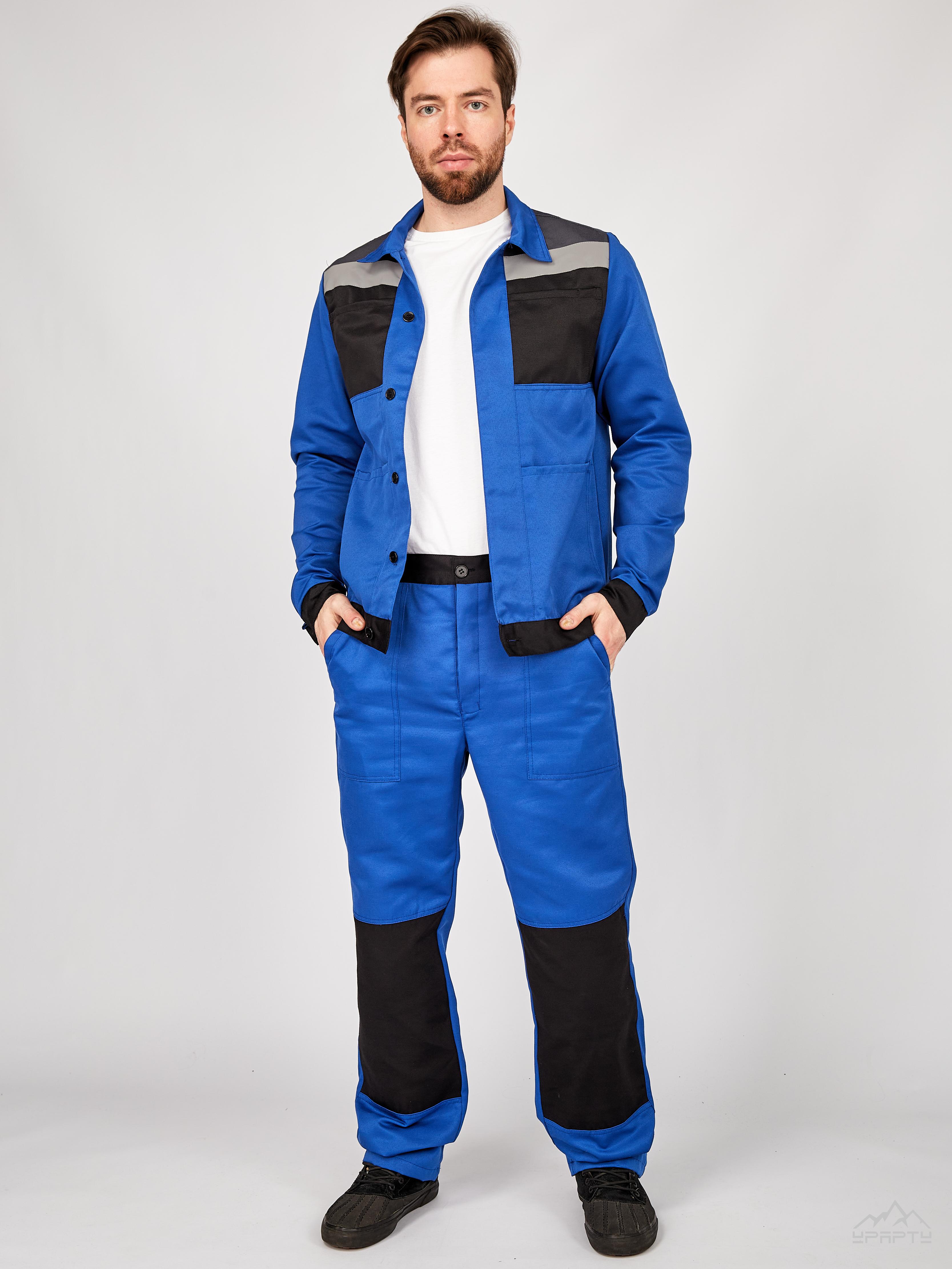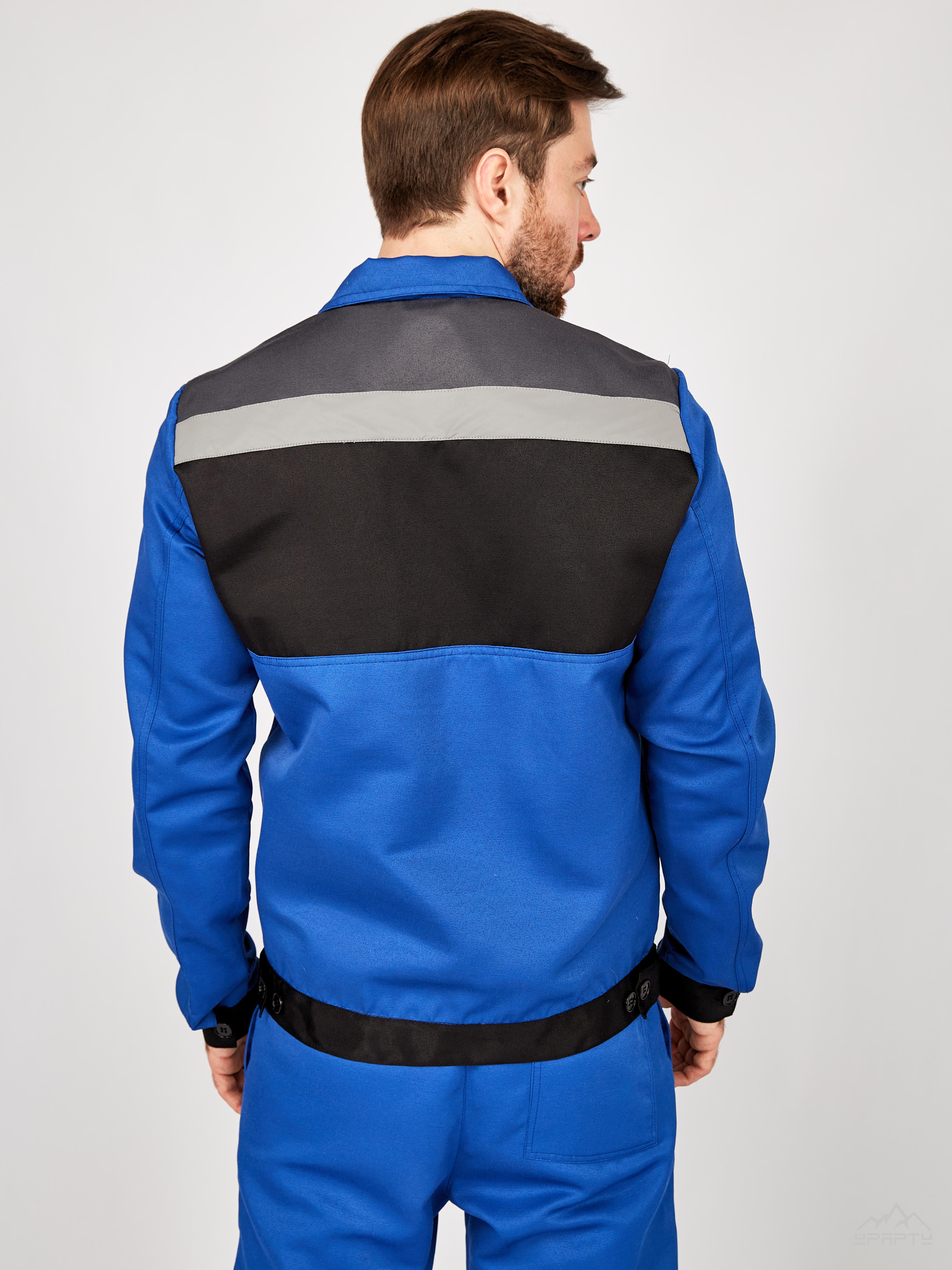 Костюм состоит из куртки и брюк. Куртка на поясе с с центральной застёжкой на пуговицы, с четырьмя накладными карманами. По кокетке полочки и спинки светоотражающая лента шириной 5.0 см. Пояс с эластичной лентой на уровне боковых швов.