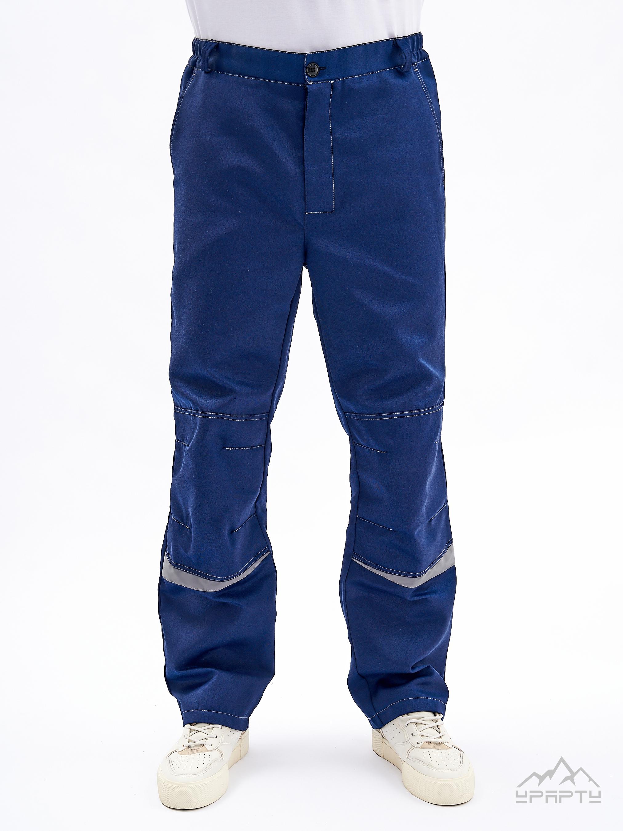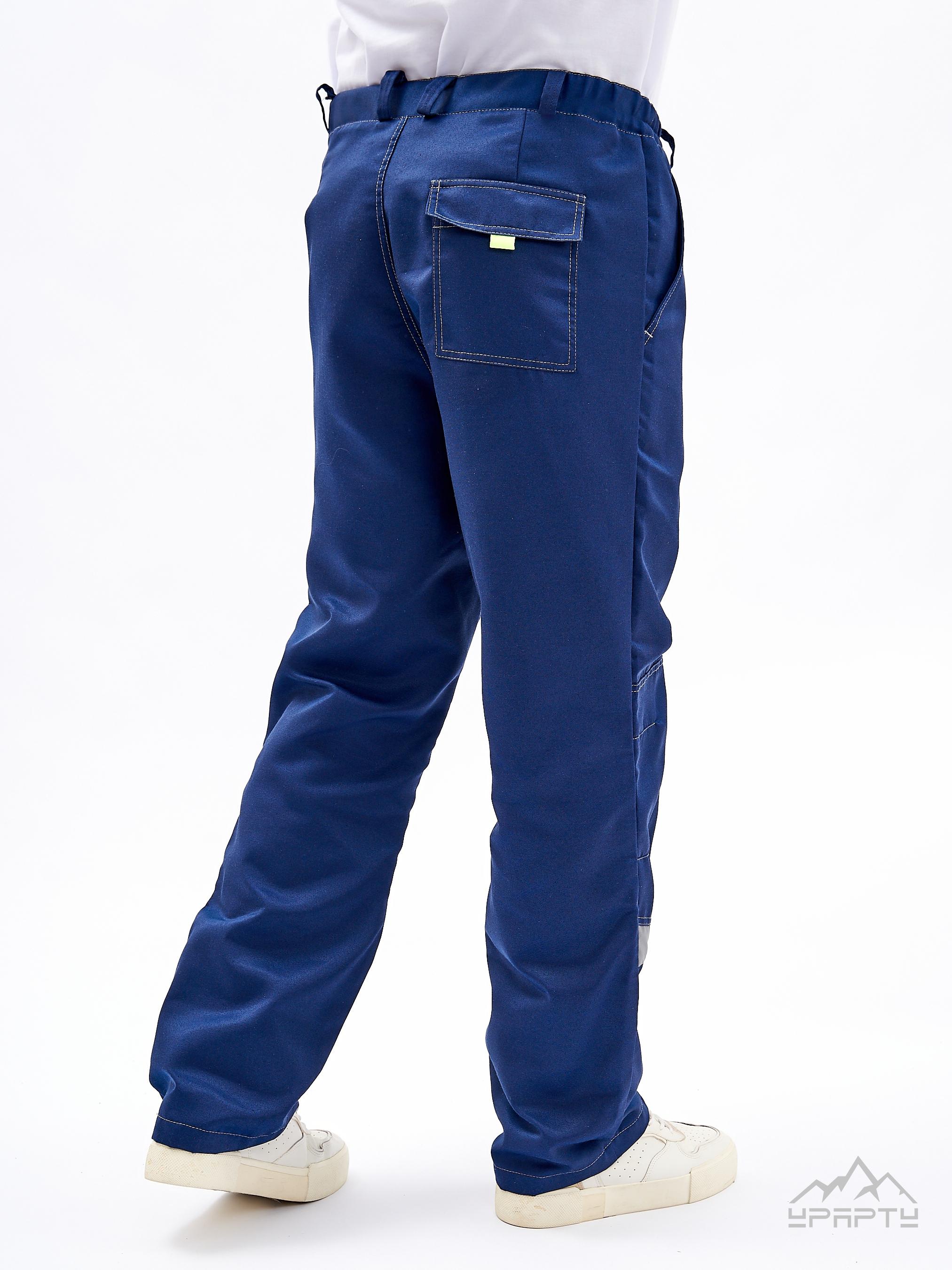 Брюки с застежкой гульфика на пуговицы, боковыми внутренними карманами, с притачным поясом. Наколенниками и задним накладным карманом с клапаном. Под наколенниками нашиты скошенные светоотражающие ленты.