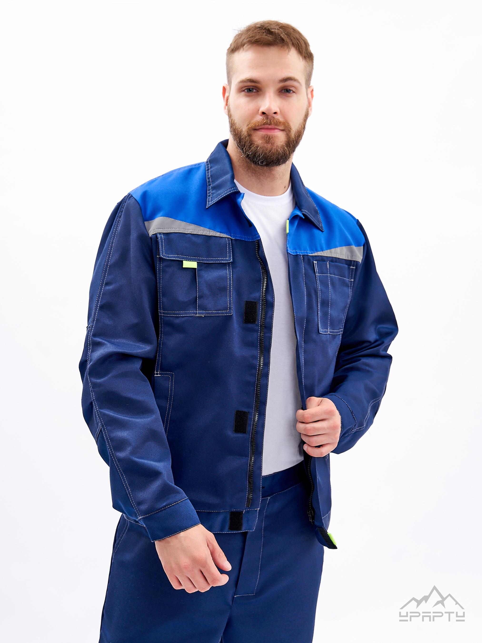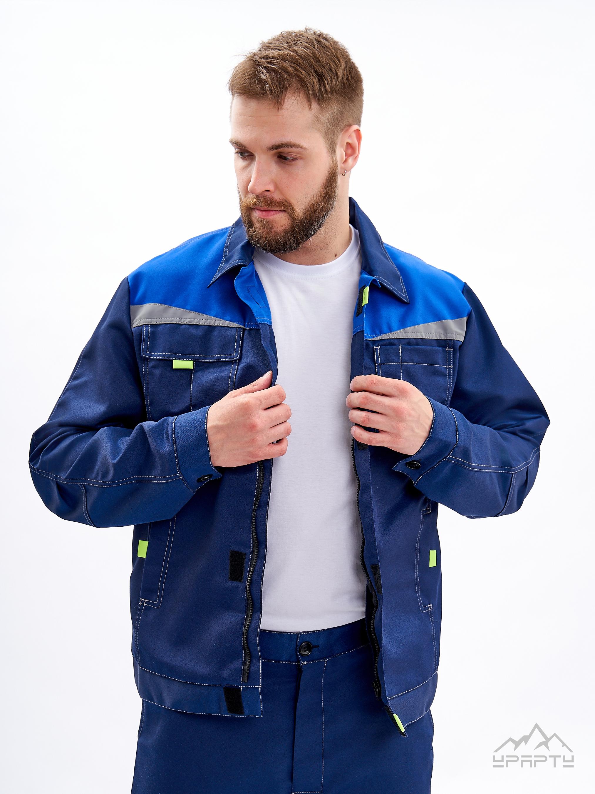 Куртка укороченная на поясе, с застёжкой на скрытую молнию и контактную ленту. Два накладных нагрудных кармана, на левой полочке карман с клапаном, застегивающимся на контактную ленту, напротив каждой - контрастные флажки для более удобного расстегивания, рукав на притачной манжете с застежкой на контактную ленту "липучка" и усилительными локтевыми накладками. По кокеткам полочек и спинки нашиты скошенные светоотражающие ленты, два боковых кармана в рельефных швах полочек. Воротник отложной.