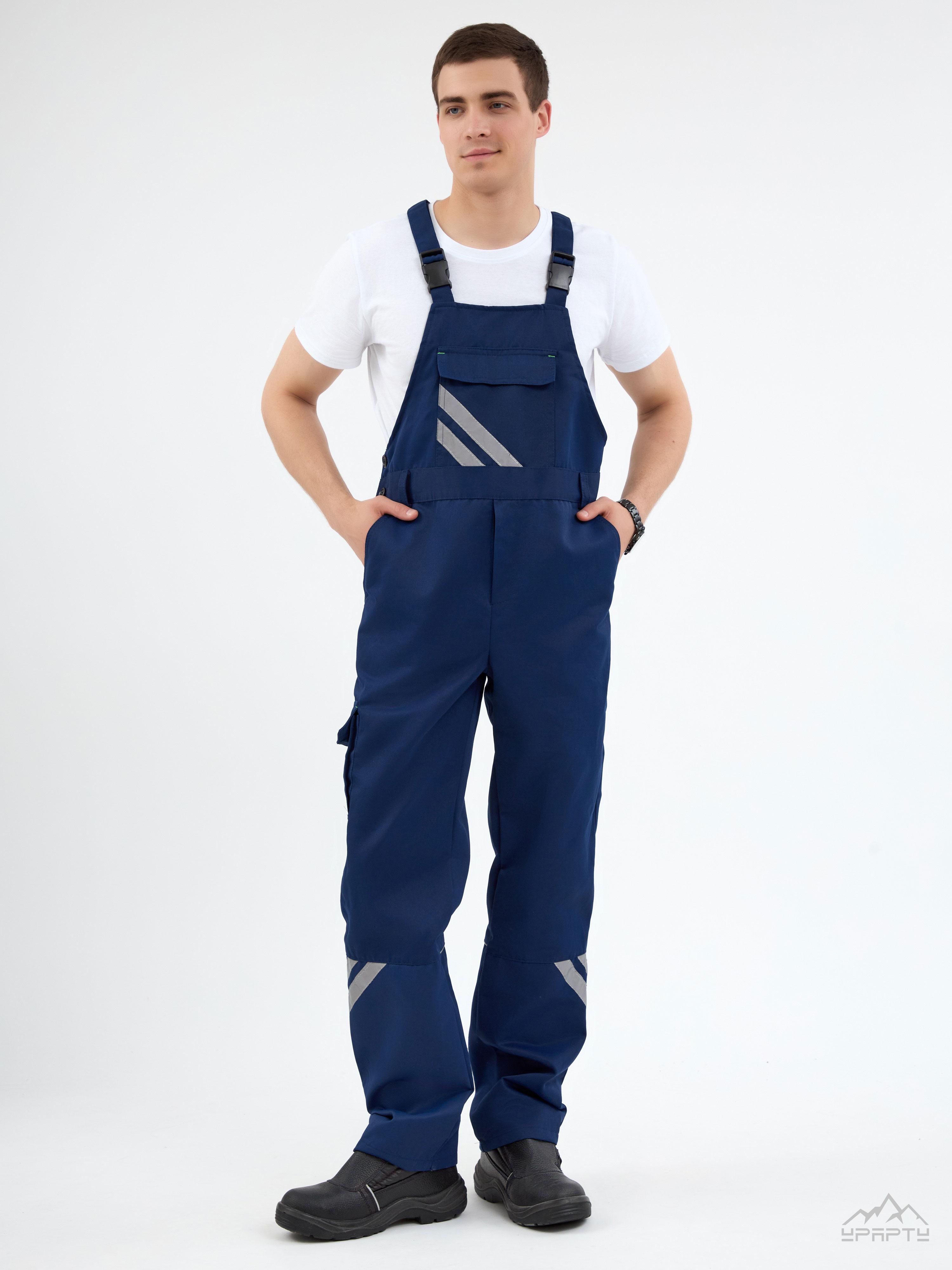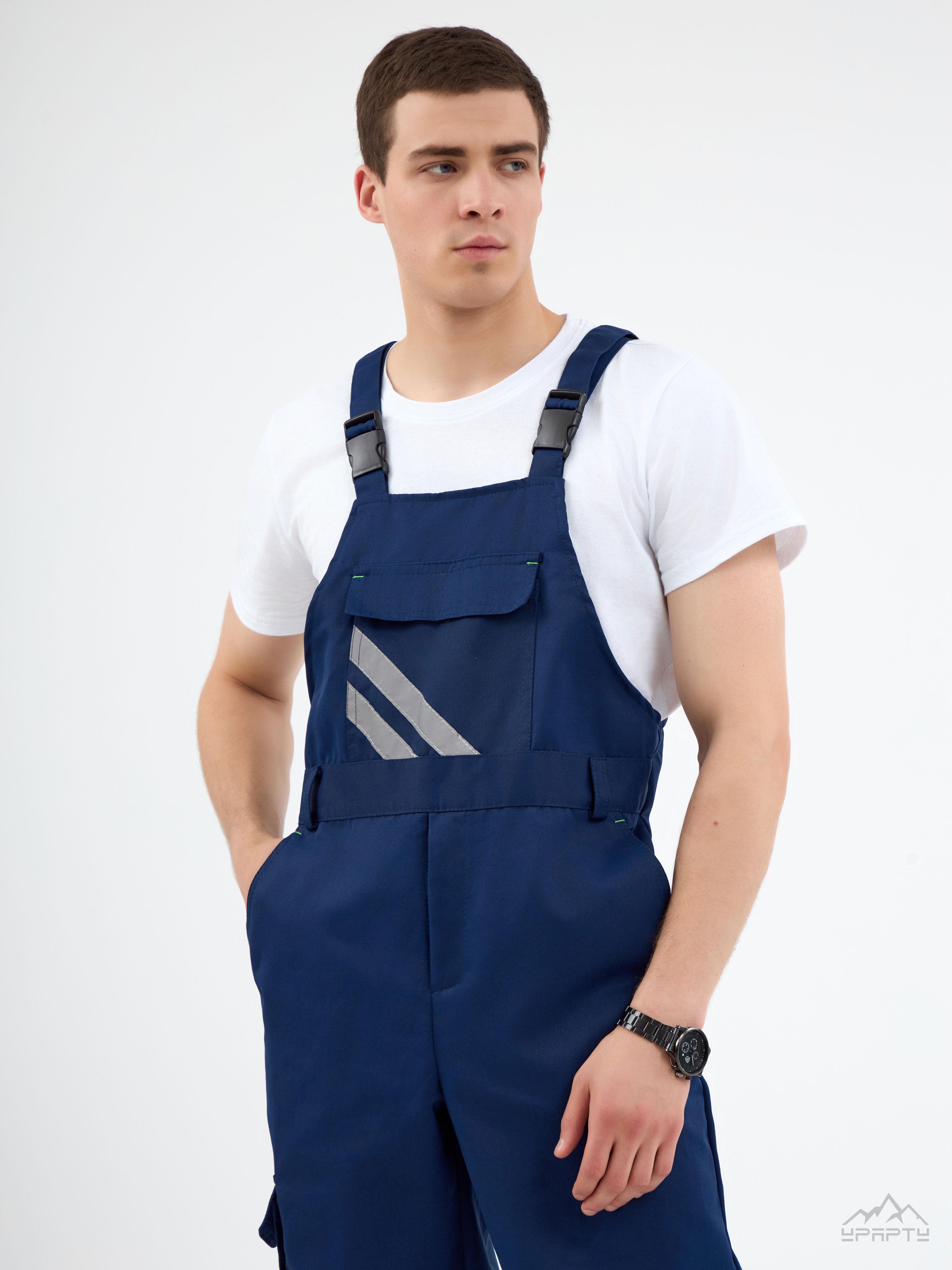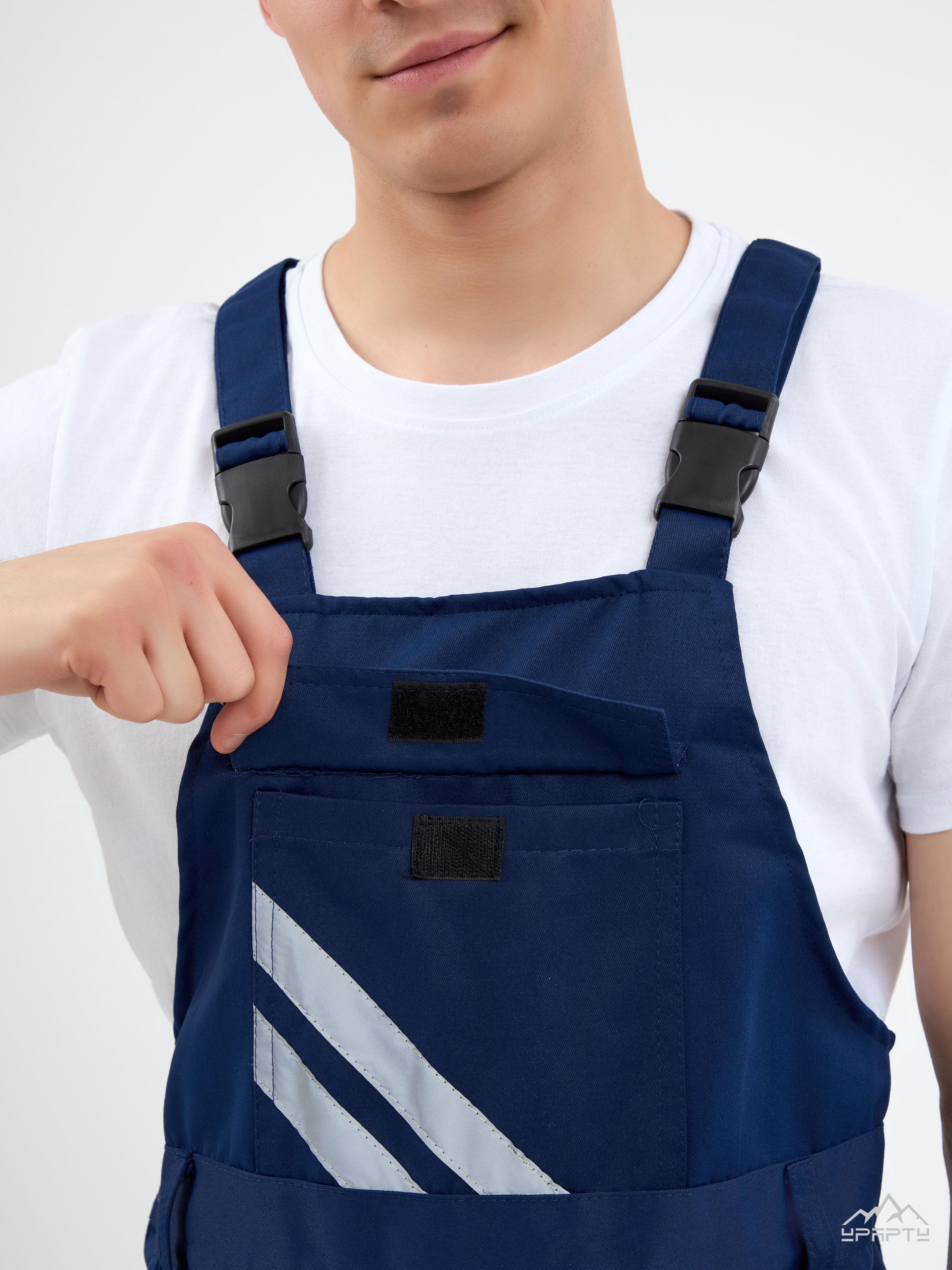 Полукомбинезон с притачной грудкой, с застежками в боковом и среднем швах, с карманами, с бретелями, со световозвращающими полосами и светоотражающими кантом.