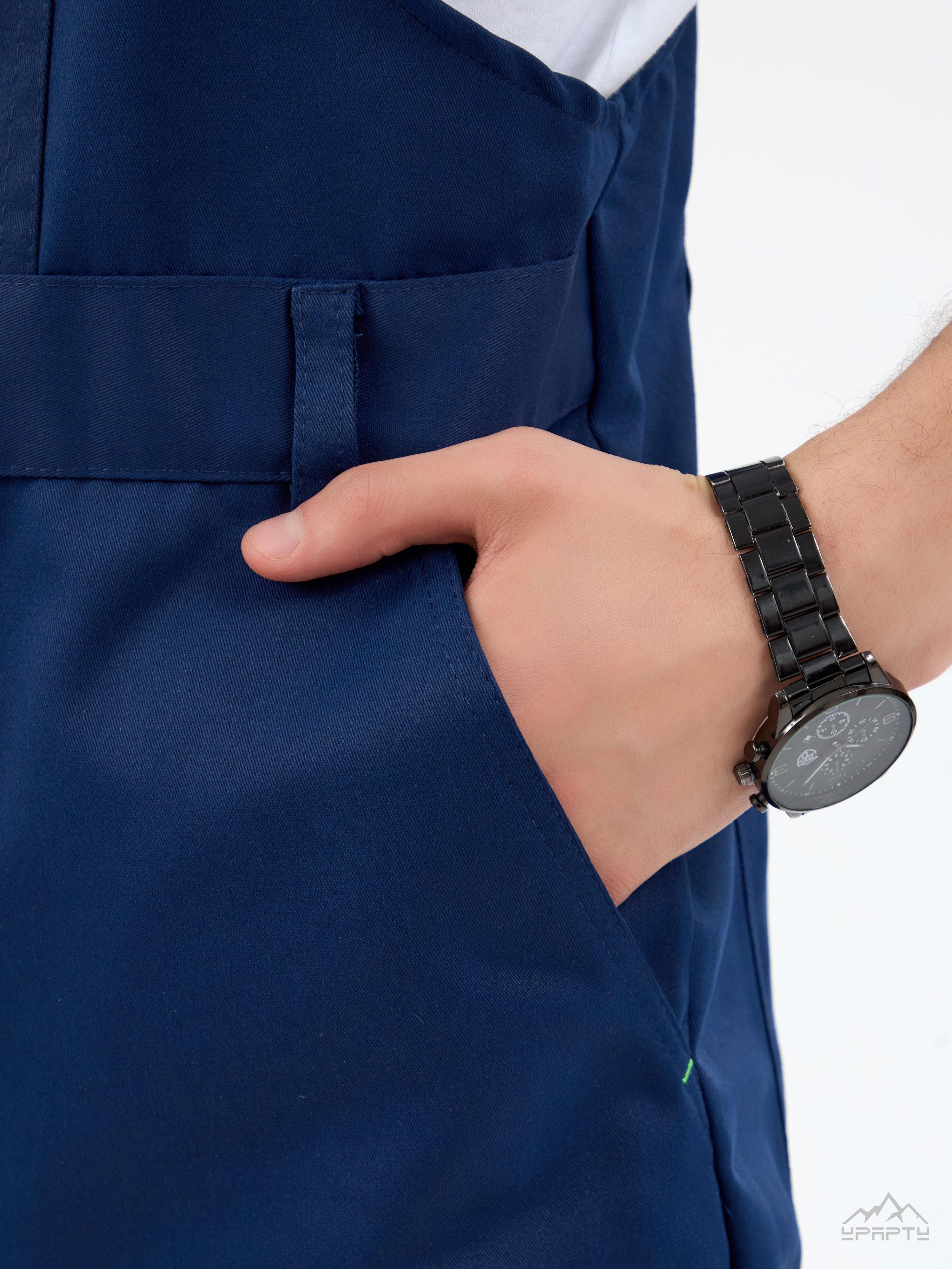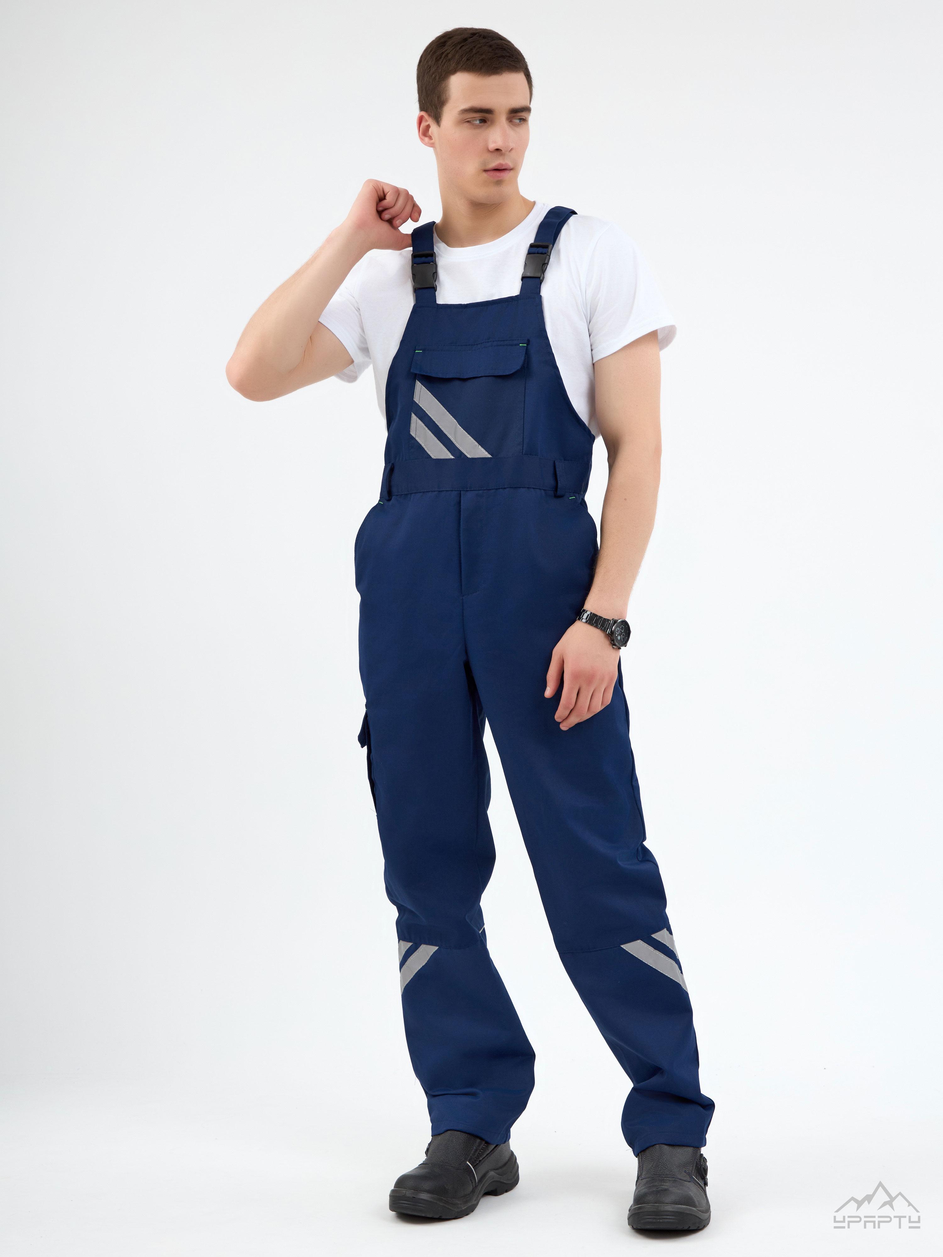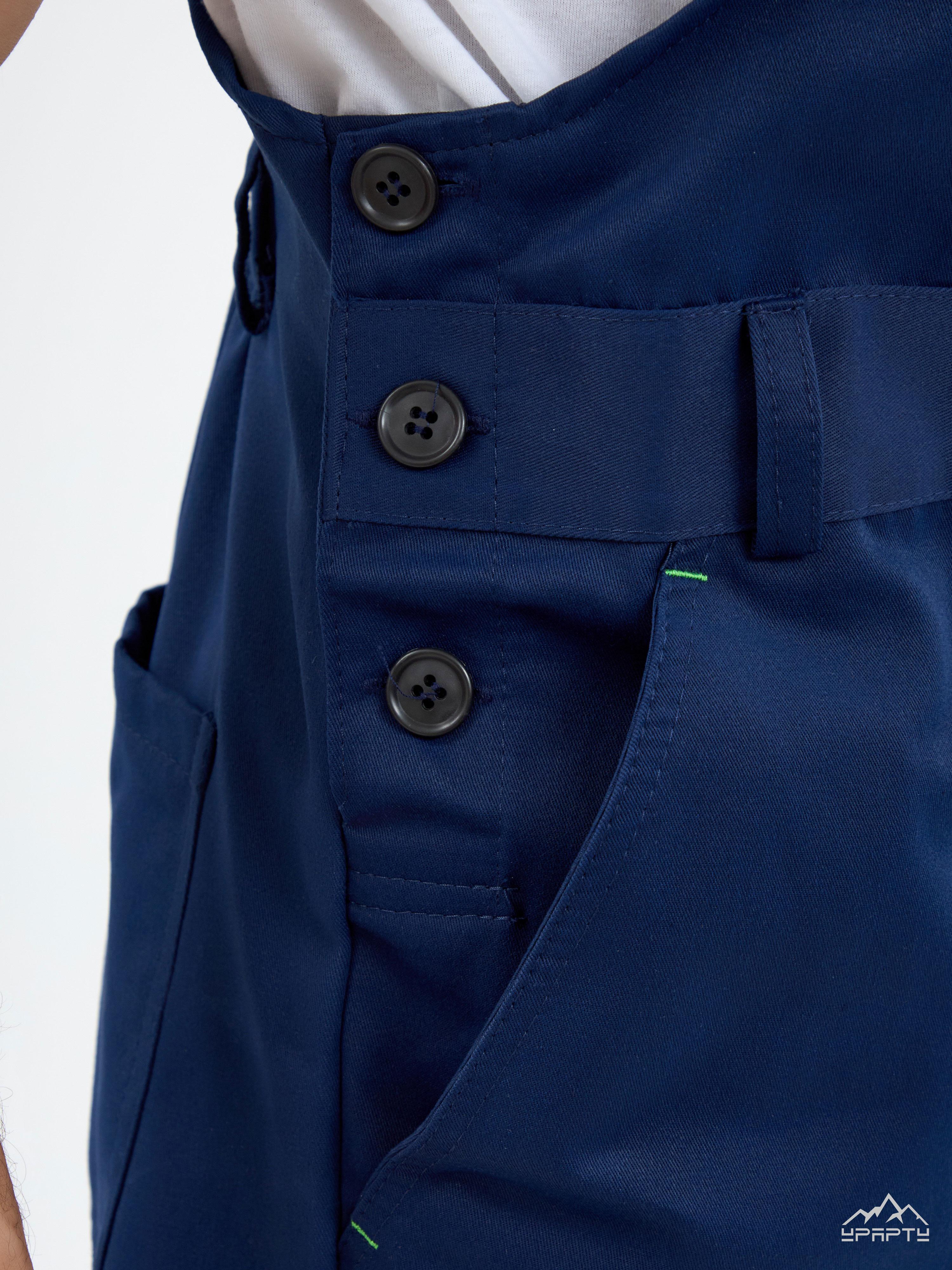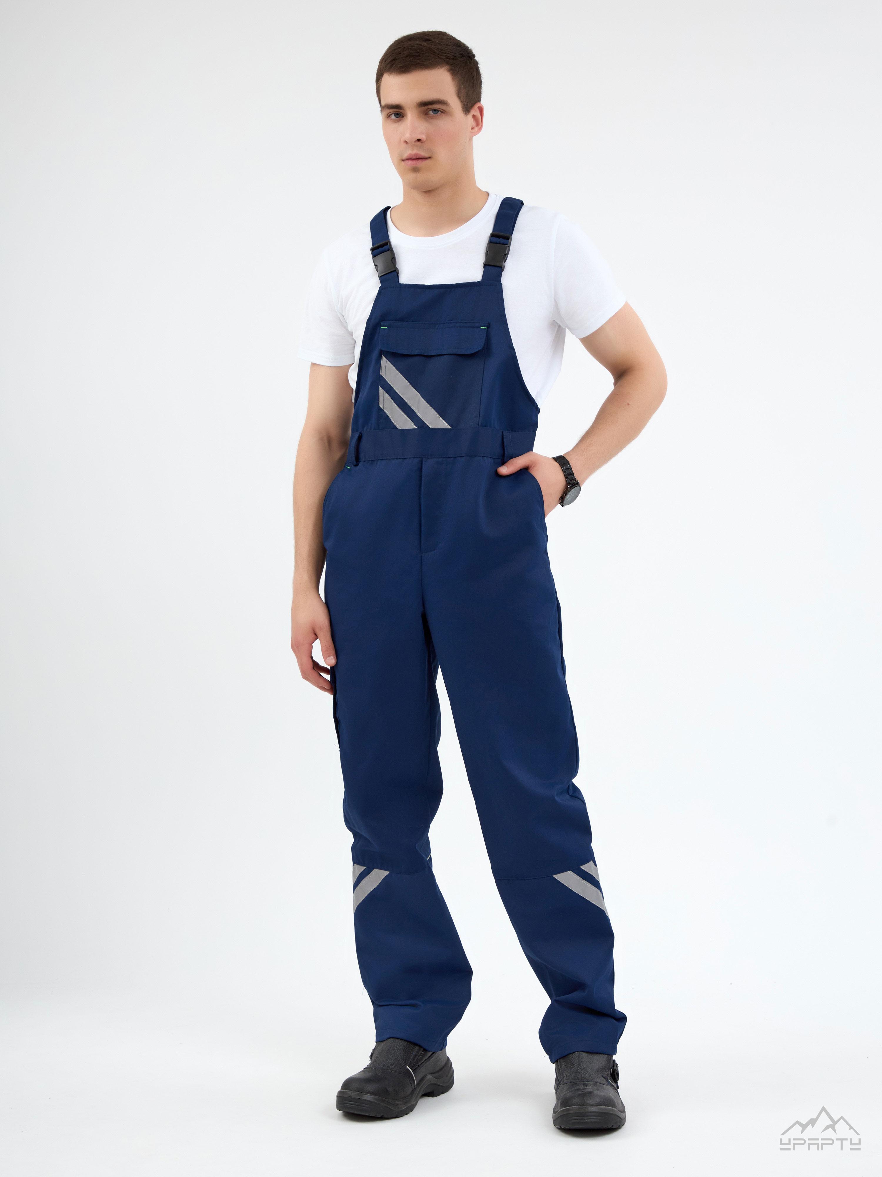 Полукомбинезон с притачной грудкой, с застежками в боковом и среднем швах, с карманами, с бретелями, со световозвращающими полосами и светоотражающими кантом.
