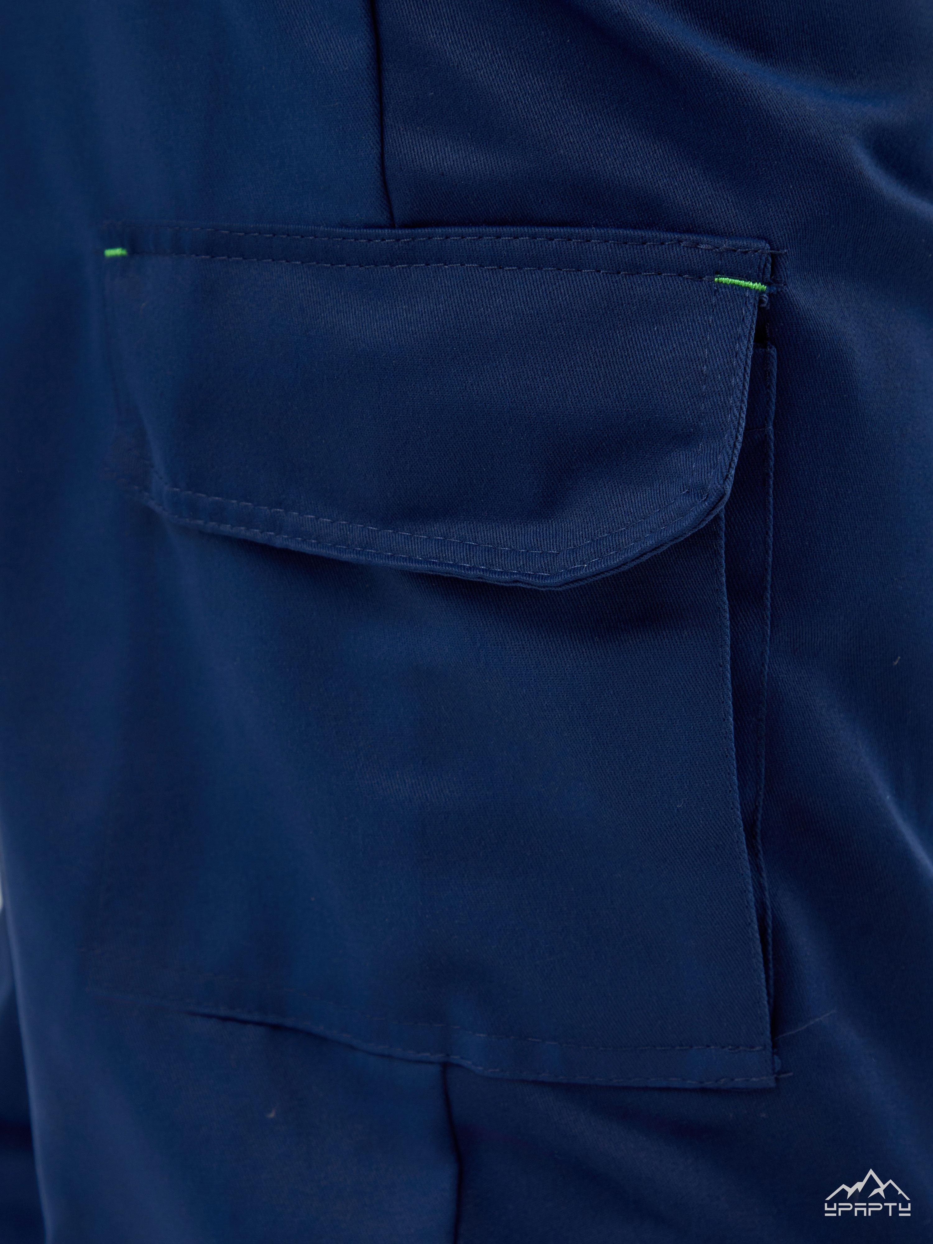 На правом боковом шве, выше линии колен, настрочен накладной полуобъёмный карман (объём со стороны передних половинок) с фигурным клапаном, застёгивающимися на один участок контактной ленты.