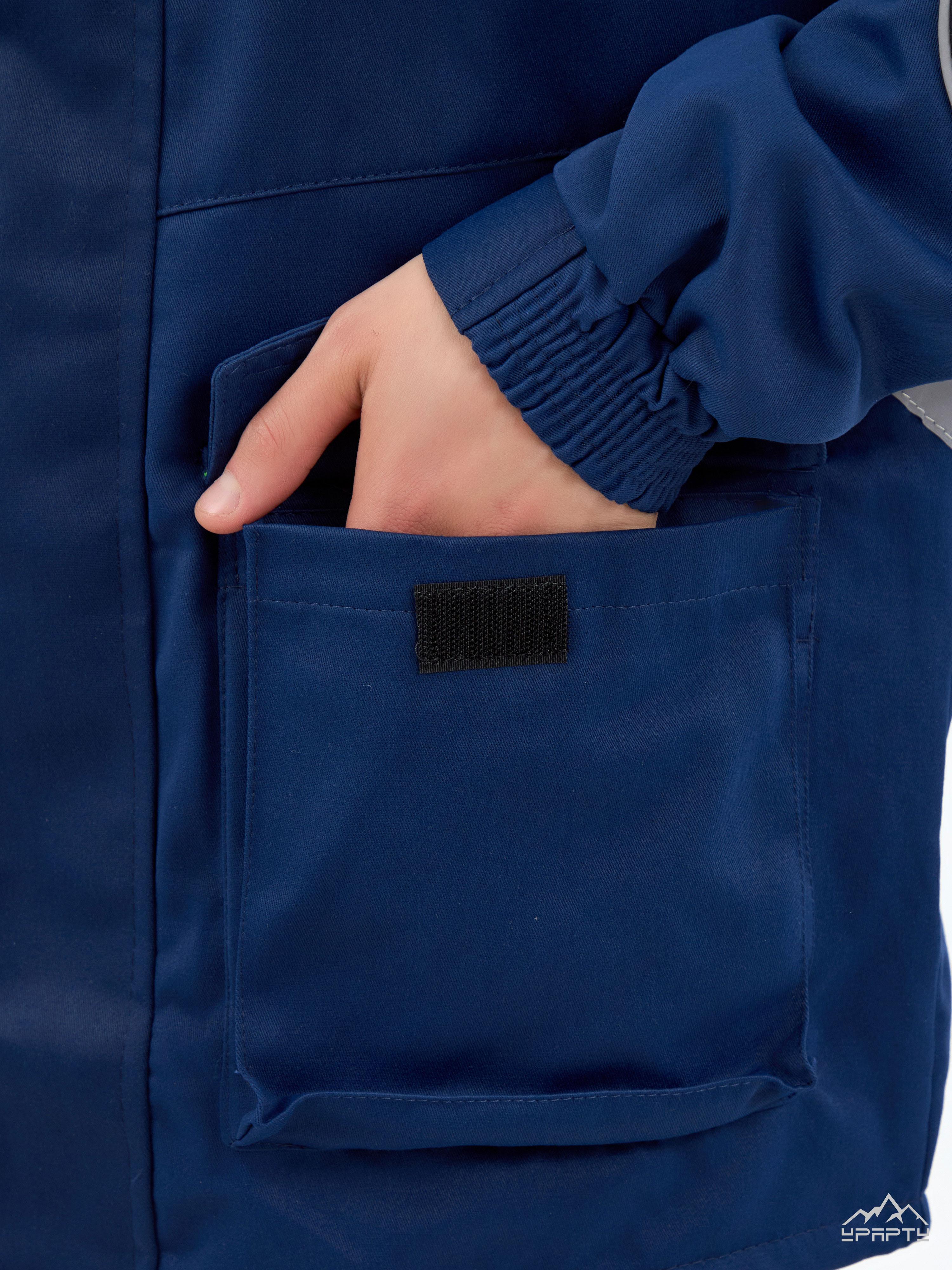 Куртка с центральной бортовой застежкой на молнию, с ветрозащитным клапаном, накладными и прорезными карманами, воротник-стойка, втачными рукавами, со световозвращающими полосами и световозвращающим кантом.