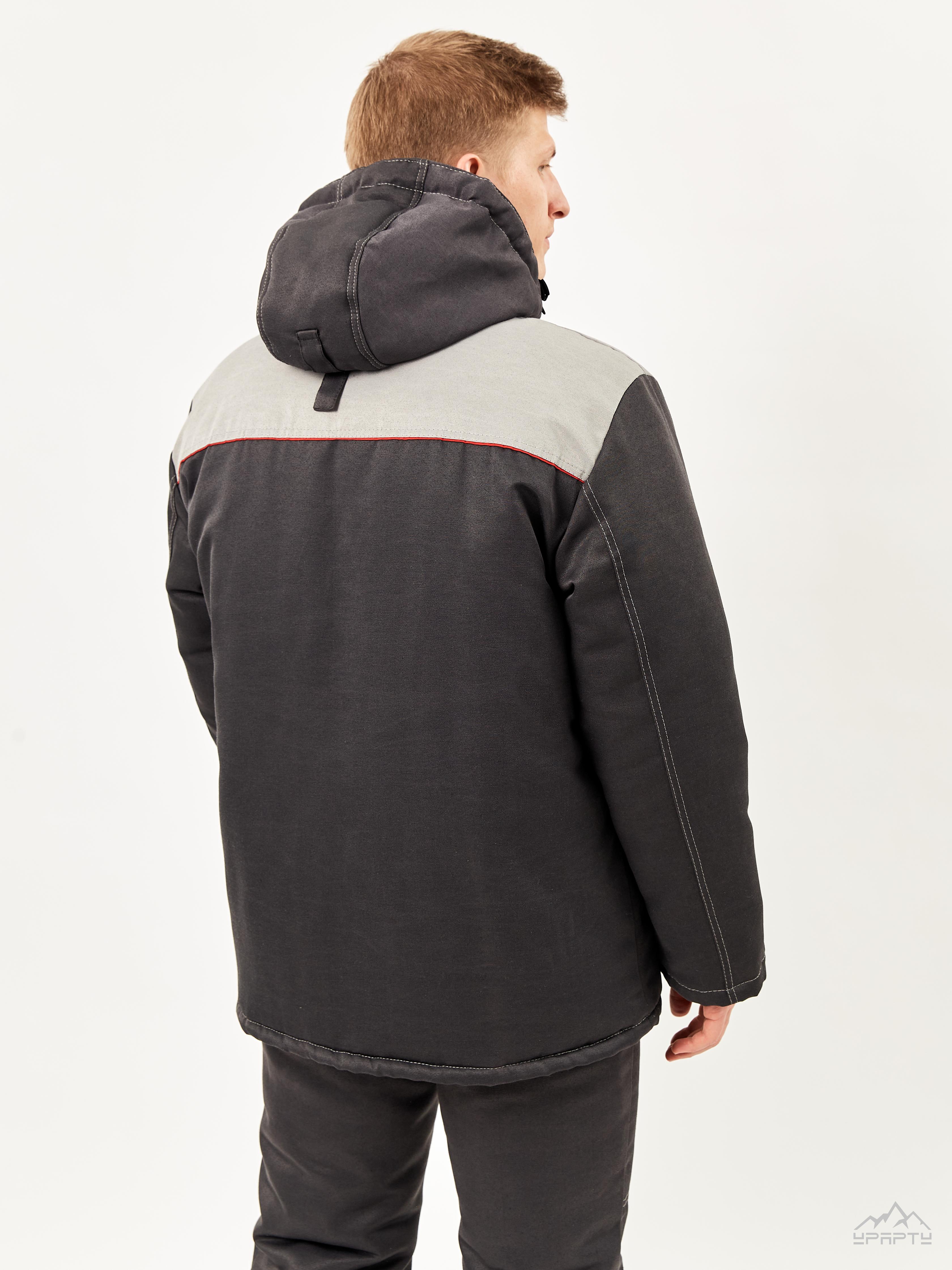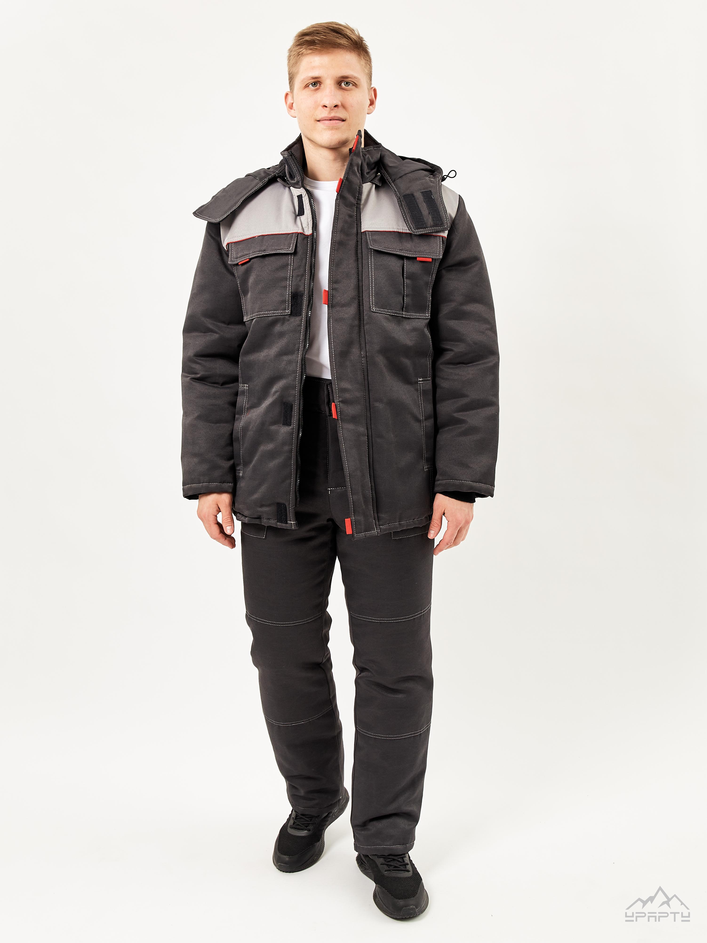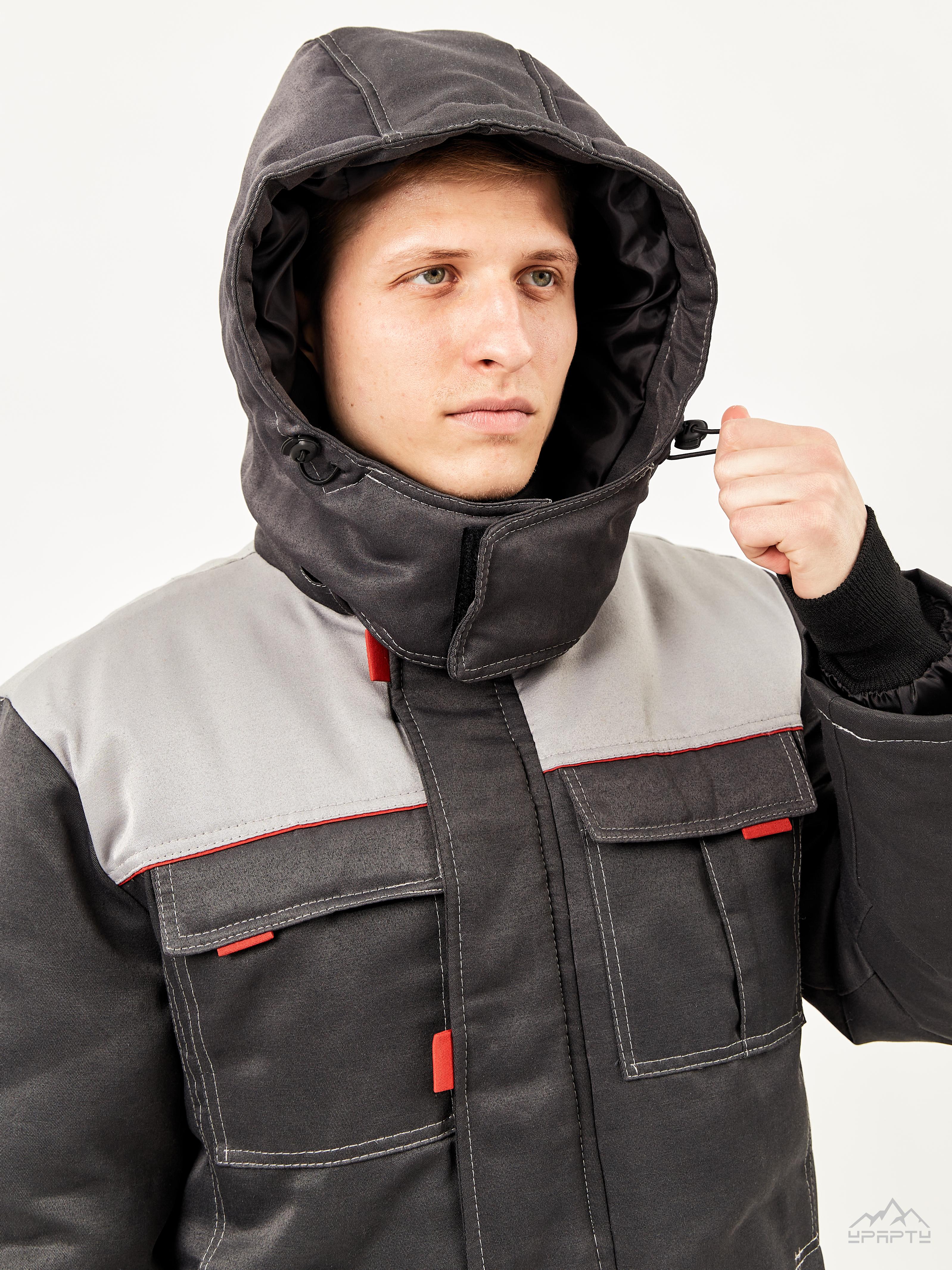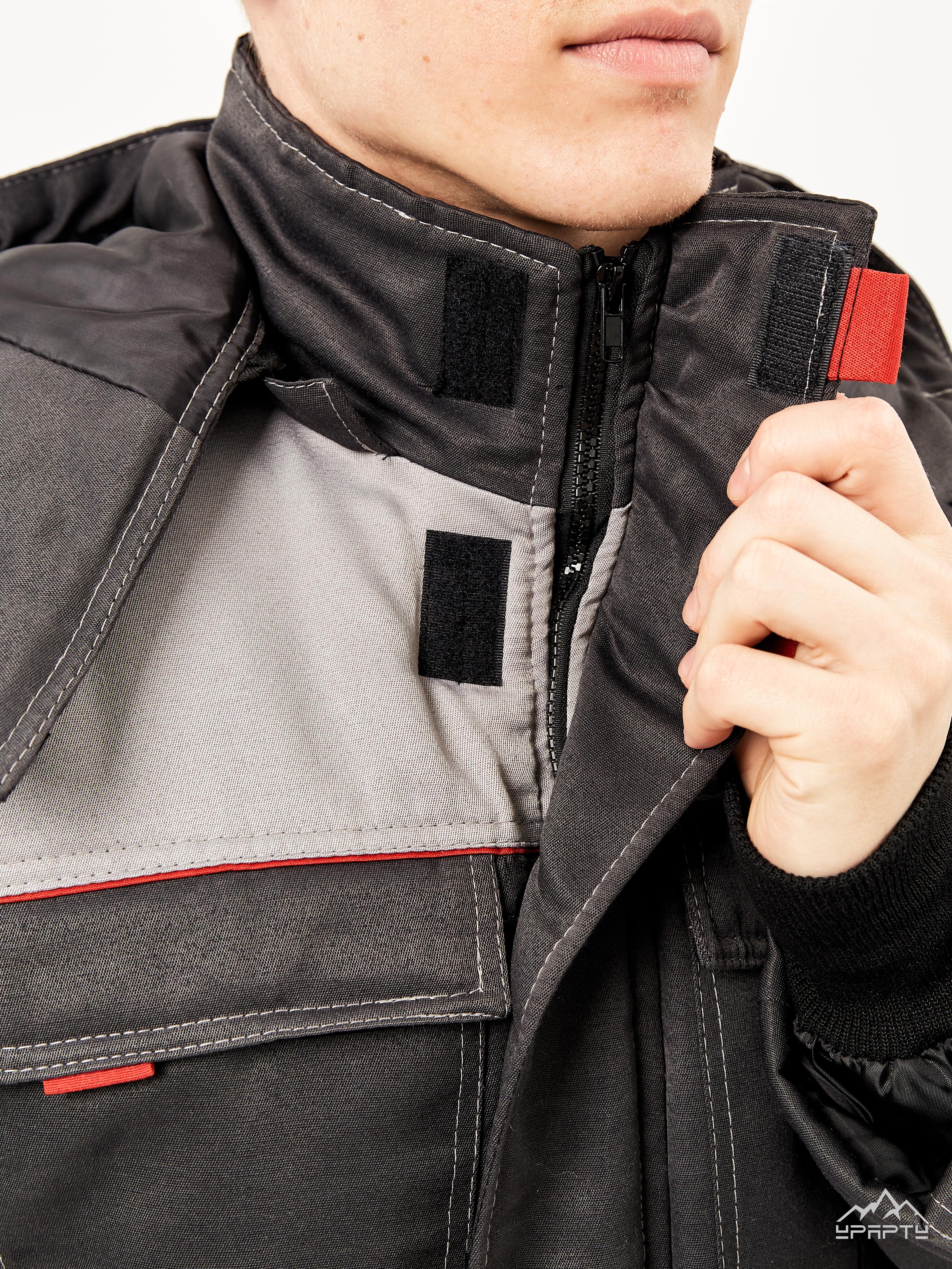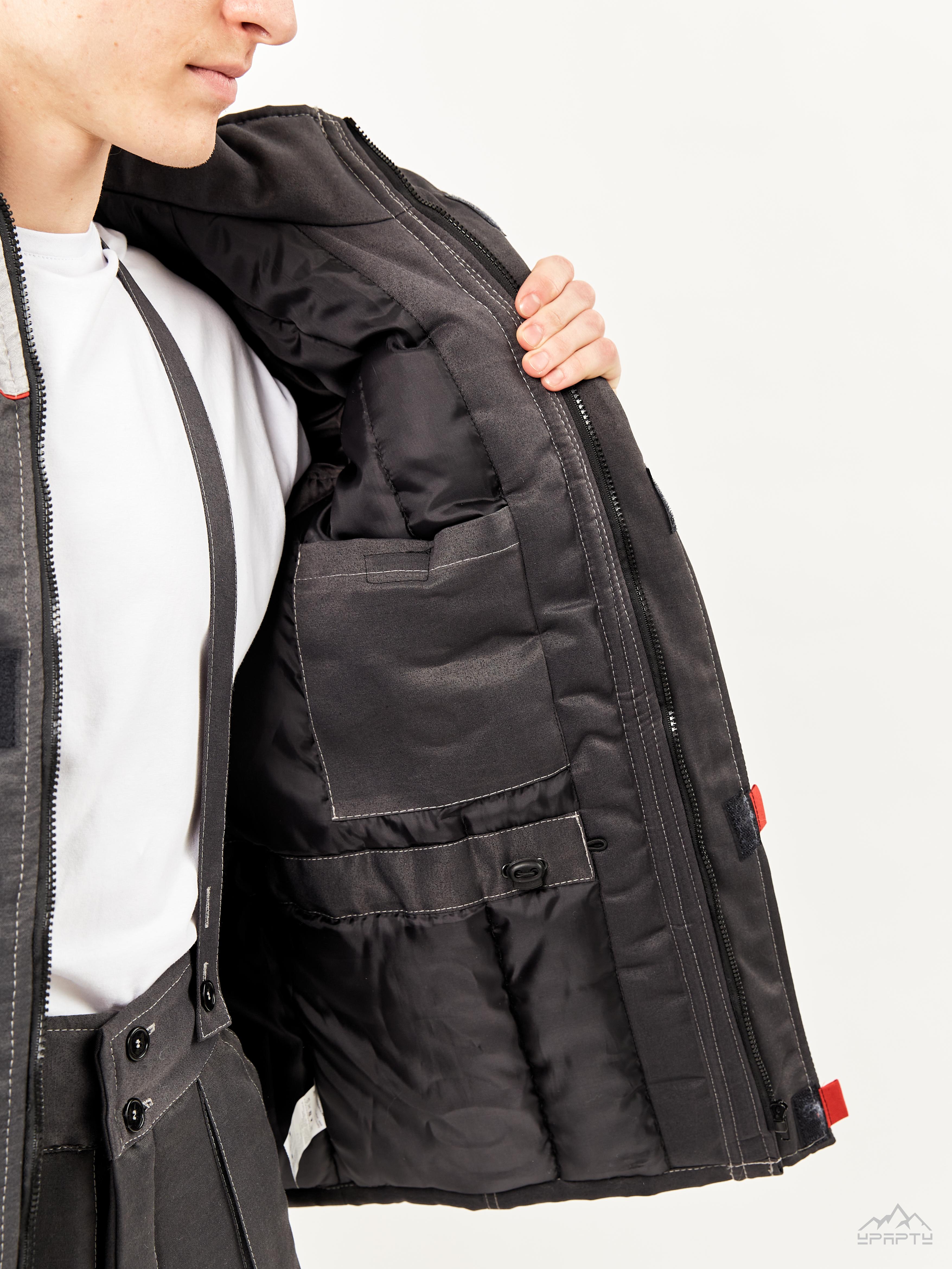 Куртка с центральной застежкой на молнию и утепленным ветрозащитным клапаном на липучках. Нагрудные накладные карманы с утепленными клапанами на липучке. Напротив каждой липучки вставлен красный флажок. Кокетки полочек и спинки выделены красным кантом. В рукавах - трикотажные напульсники. Внутренняя кулиса по линии талии для регулировки ширины куртки со шнуром-резинкой и фиксаторами. Накладной карман на липучке со стороны подкладки левой полочки. Отстегивающийся капюшон на молнии с лицевой кулисой со шнуром-резинкой и фиксаторами и хлястиком на полукольцах для регулировки высоты капюшона.