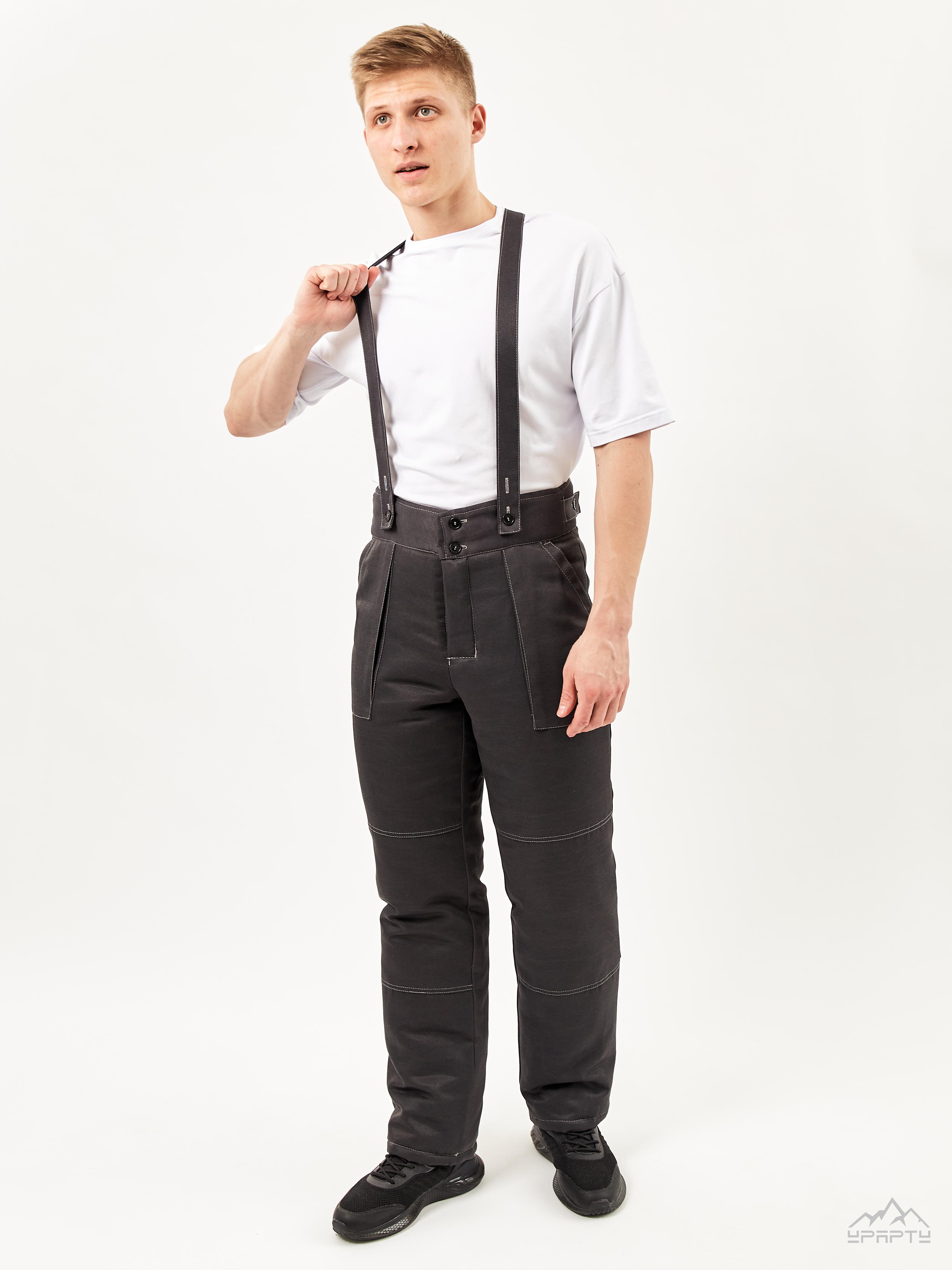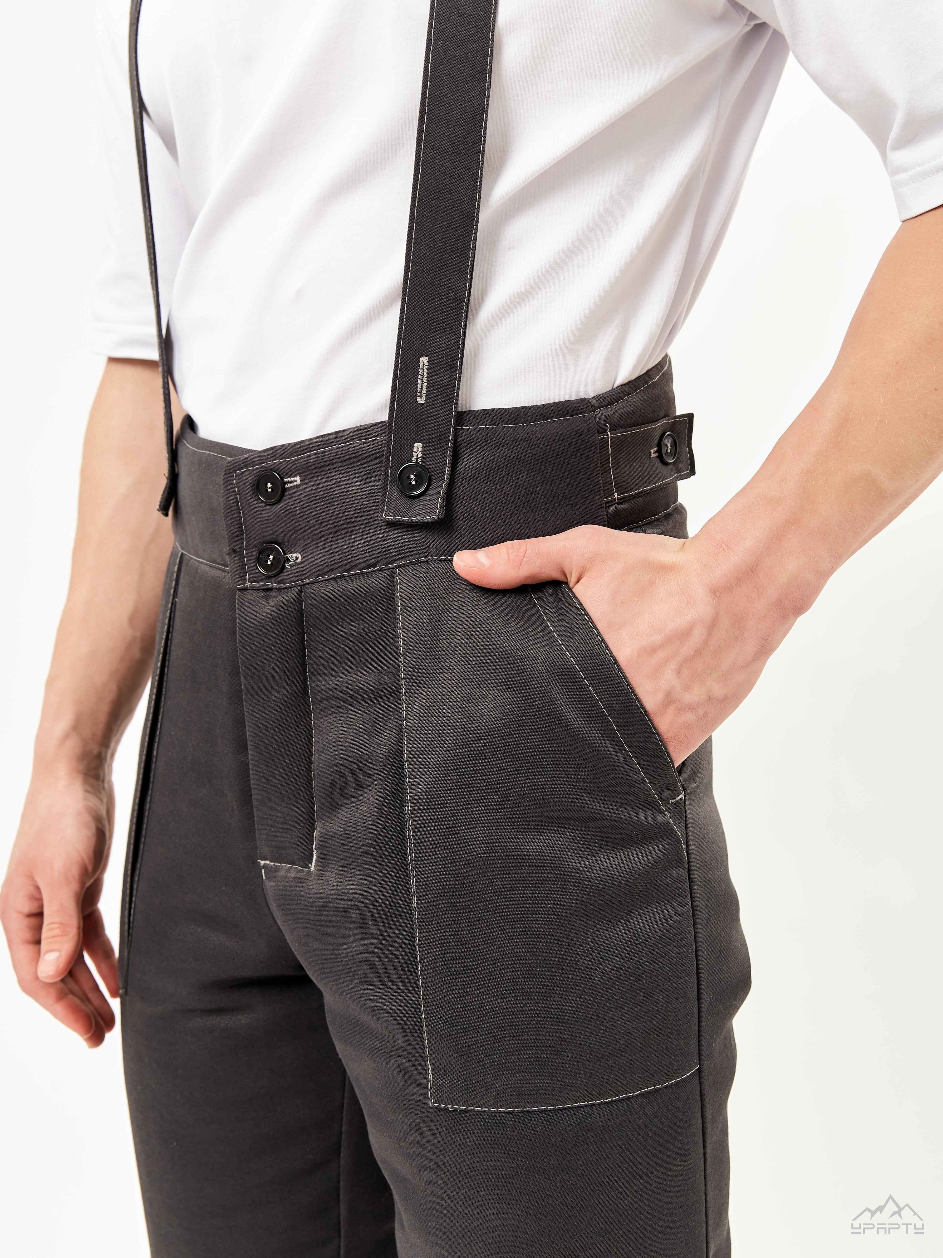 Брюки прямые, на широком утепленном поясе, завышенным со стороны спины, на съемных бретелях на пуговицах, регулируется по ширине с помощью хлястиков на пуговицах в боковых швах. Накладные карманы со складкой в верхней части брюк. По низу кулиса со шнуром-резинкой и фиксаторами.