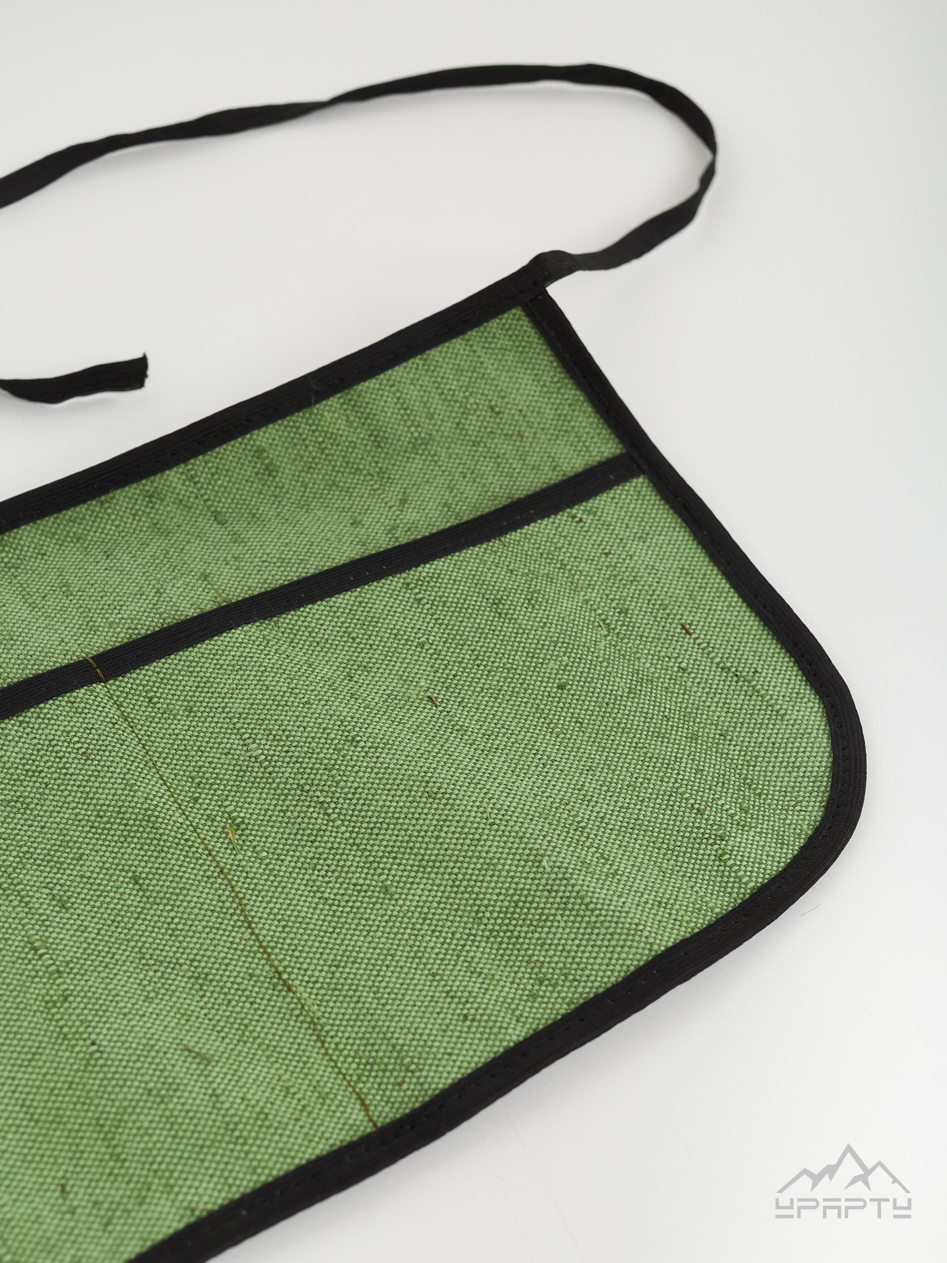 Фартук типа Г без нагрудника, с притачным поясом (тесьма окантовочная), завязывающимся сзади. Двойной слой брезента разделен отстрочкой на два больших кармана для инструментов.